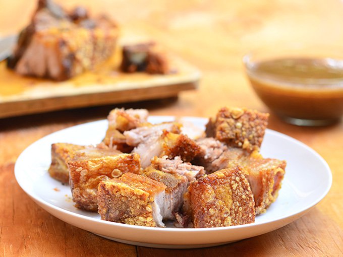Lechon Kawali is a Filipino dish it is a seasoned crispy pork-belly friend in a pan.